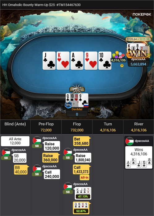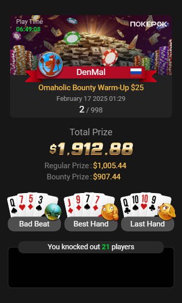 третья раздача, открываемся с УТГ у нас JJ, стадия уже не ребая, поэтому они начинают играть аккуратнее. Получаем кол от +1 и ББ. доска 682 мы грузим 75% пота, получаем пасс от УТГ и быстрый кол от ББ, терн К, у бб осталось уже примерно 30% фишек от банка, на его чек я допушил, получил кол от К8. Что мне не понравилось, это то, что дилер почему то радовалась за моего оппонента, такое я видел впервые. Через буквально 10 раздач, с этим же дилером я проиграю ему огромный банк в средний стек турнира. Открывается МП, он на CО заколит, блины были 600-1200 у меня в стеке примерно 22 тысячи и валеты на ББ, мы давим пуш, получаем два кола, у ребят еще тыщ по 45 за спиной. Доска 24Т, МП чек, КО пуш, я еще подумал спасибо тебе за пуш, не даешь реализоваться всяким бродвеям у МП. У него АТ, терн Т - домой. Еще там сыграл меджик баунти и обычный баунти. Фишки они конечно часто дарили на ровном месте, но в ключевых выставлениях мы не могли ничего сделать. Входов было не много мейн собрал 320 входов, меджик баунти 150, обычный баунти около 110, но обычно на этих сериях у меня и получалось пройти глубоко даже без карты, за счет слабого поля, но не в этот раз. А вот вспомнил еще раздачу. У нас АКs, мы на бтн, открываем и получаем кол от СБ. получаем доску J9 нашей масти и 3, глубина примерно 35ББ и СБ с какого то перепуга ставит оленя. Я таки нажал кол и посмотрел на AQo, человек за столом сказал что еще одну даму выкинул, но это не помешало на любимом терне найти даму бубей и высадить меня с турнира практически за чиплидерский стек. Были там и оплаты по 5ой паре на весь стек, и блефы в меня с нулевым эквити. Неплохо против них работали и индьюсы, но надо тащить олени :).