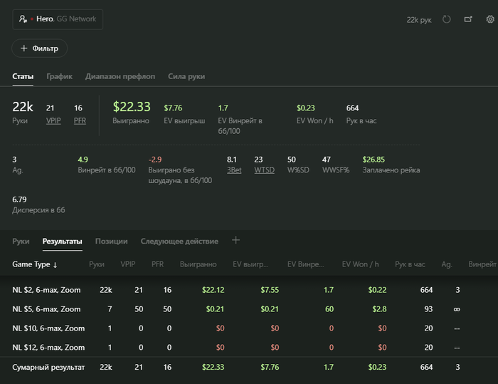 micro_reg, красавчик, точно есть прогресс по сравнению с первым графиком)) но о том какой у тебя винрейт можно будет говорить после 100к рук. Зум сама по себе дисциплина где винрейты ниже, чем за рег столами, так как там можно выбросить среднюю руку, и перейти к следующей раздаче (у любителя меньше шансов сотворить дичь)