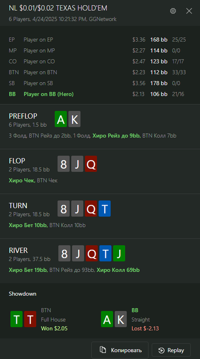 на баттоне Т8s открываем 2.5бб, получили колл на ВВ.