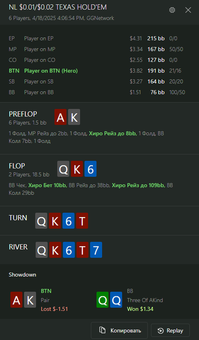 На префлопе 3бет 12-14бб, плотная ставка по флопу, и олл-ин на терне.