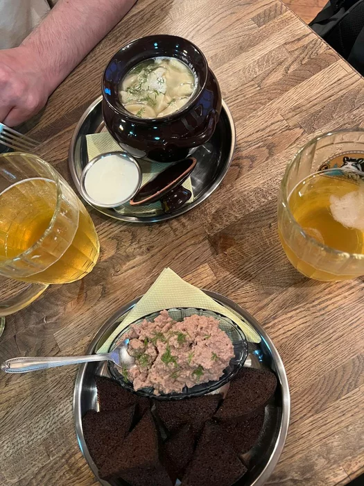 Интерьер реально как в квартире у бабушки, встречает замученная официантка, лежащая лбом на барной стойке) Узнаем от нее что на кране всего два пива от лидской пивоварни ( не особо ее котирую, только коллекция майстер у них неплохая) светлое и темное, заказали пельмени и бутерброды с паштетом. Пиво обычное, неинтересный лагер, пельмени ок, паштет так себе.