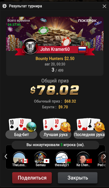 Привет. Очередная сессия и в этот раз закончилась положительно . Дошёл до финального стола в турнире Bounty hunters $2,50 занял 7 место из 909 участников. На финальном столе совершенно не складывалось хотя был на 3-м месте по стеку. Стек позволял играть, но зона ITM давила и руки не сдавали, без вариантов. Ошибок не допускал, на финальном столе по учувствовал ровно в 3-раздачах. Но грех жаловаться, за то в течении всего турнира сдавали прекрасно. Результатом больше чем доволен.