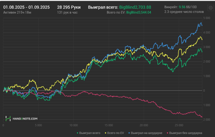 Под конец сил почти не осталось, чувствовал себя выжатым и уже не было энергии ни на что. В процессе внес одно изменение - отключил низ загрузки. Из-за этого игра заметно сократилась. Она конечно есть, но всё познаётся в сравнении. Для примера: в майском марафоне за месяц без выходных я наиграл 64k рук и 350 часов, а в августовском — 35k рук и 230 часов (и это с учётом того, что первую половину месяца низы ещё не были отключены).