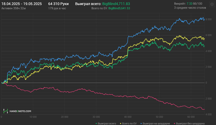 Переход из МТТ в кеш — это интересный поворот. Судя по графику, у тебя была хорошая турнирная база, которая поможет в кеше, особенно в плане дисциплины. История с недоездами - это классика МТТ, но всё действительно происходит к лучшему. Возможно, именно эти «почти» и подтолкнули к смену формата, где ты найдешь свою игру)