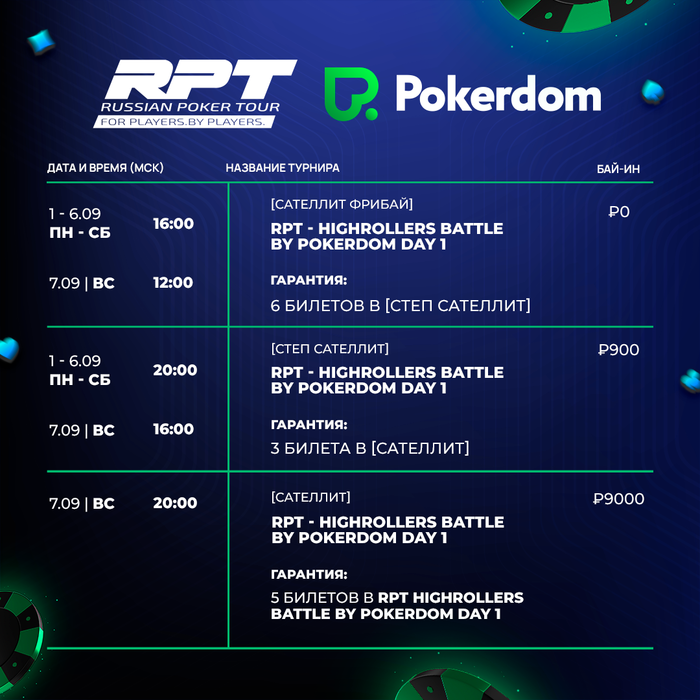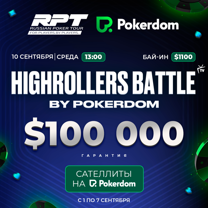 🏆 Турнир Highrollers Battle By PokerDom — самый дорогой ивент в расписании сентябрьской серии RPT. Он пройдет с бай-ином $1,100 и гарантией $100,000, даты проведения турнира — 10-11 сентября.
