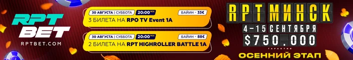 🏆🏆🏆 Сателлитный вечер, который просто нельзя пропустить! Сегодня в руме RPTBET будет разыграно минимум 9 билетов в три различных турнира серии RPT 4-15 сентября в Минске.