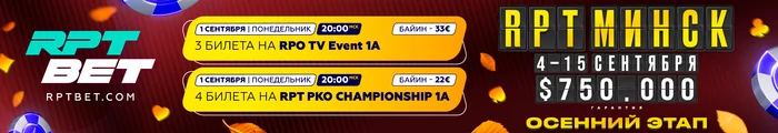 🏆🏆 Финальный рывок в онлайн-сателлитах к серии RPT 4-15 сентября в Минске — сегодня в руме RPTBET будут разыграны минимум ТРИ БИЛЕТА в турнир RPO TV Event, а также минимум ЧЕТЫРЕ БИЛЕТА в турнир Belarus PKO Championship.