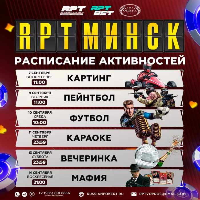 Закроет развлекательную программу одна из любимых игр покеристов — Мафия. Играть будем прямо на турнирной площадке, а лучший игрок получит настоящий кубок, а также ценные призы от наших партнеров RPTBET.