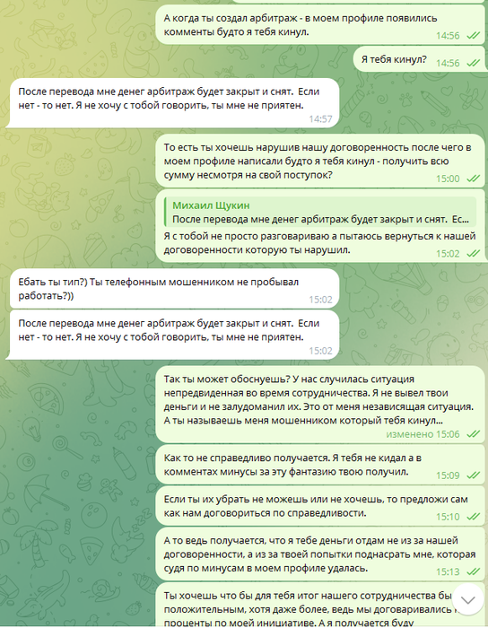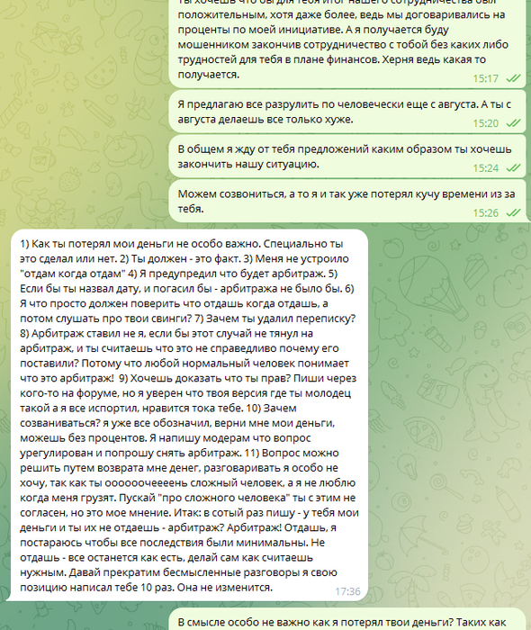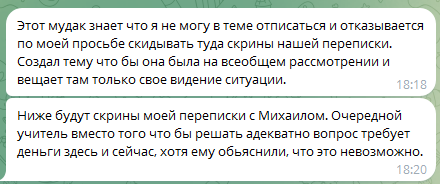 Создавший арбитраж отказывается выкладывать по просьбе второй стороны скрины переписки, хотя знает о его блокировке. Это поведение человека который хочет честного рассмотрения арбитража? Ответчик уже предоставлял скрины выше где он просил модераторов сайта позволить ему от писываться в этой теме, но получил отказ. Я по его просьбе выкладываю сюда все что он просит. Это не запрещено?