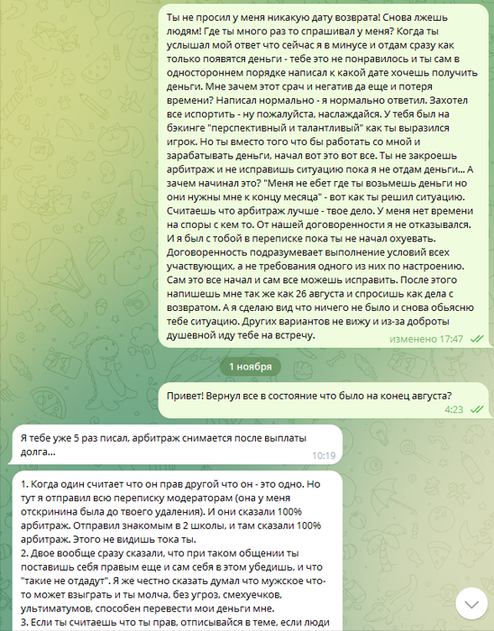 Ты потратил мои деньги! и не вернул! Меня НЕ УСТРОИЛО ТВОЕ "ОТДАМ КОГДА БУДУТ"! Пойми ты это. Я сказал скажи когда отдашь ты не ответил, я сказал тогда будет арбитраж. Ты удалил переписку и слился. Появился арбитраж, появился и ты. Ты как думаешь этот вопрос решиться должен??? с тебя всё должны снять, а я должен просто ждать когда у тебя появятся деньги чтобы ты возможно мне их отдал? Отдашь - возможно снимут. Я так это понимаю. Не отдашь - ходи с плашкой.