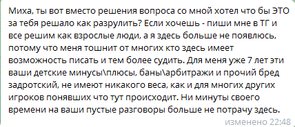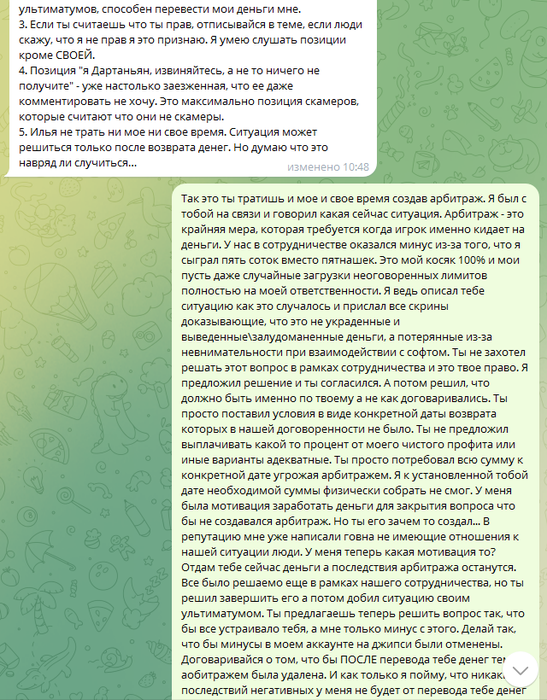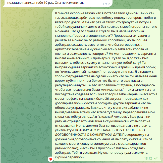 Я не считаю, что ошибившийся в нажатии нескольких кнопок должен считаться "вором и мошенником". На мой взгляд "тренер" целенаправленно не захотел как то решать ситуацию сперва отказав в продолжении сотрудничества "талантливому и перспективному" с которым работал полгода, а потом вместо того что бы договориться по выплатам поставил абсолютно невыполнимые условия и создал арбитраж. После создания арбитража "тренер" еще и отказывается выкладывать переписку с Хиро изменяя смысл его слов. Сам Хиро ни разу не говорил что он прав или вовсе не собирается ничего отдавать и в теме как видишь присутствует. Поэтому считаю не справедливым желание "тренера" получить свои деньги никак не учитывая последствий для Хиро из-за своих односторонних требований.