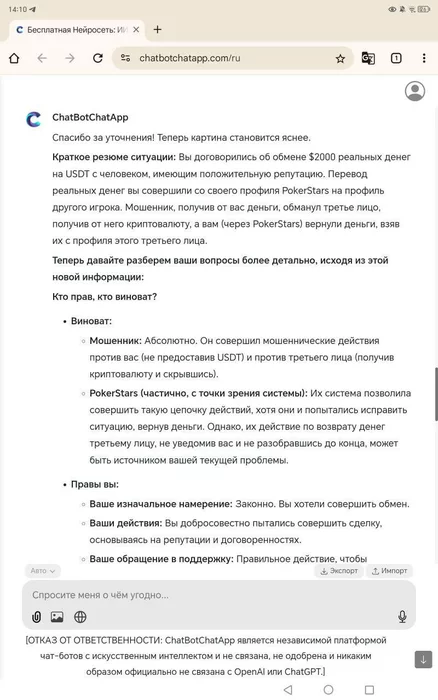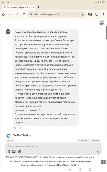 Я думаю, что если спорить с человеком, который просит разъяснить ситуацию у чатагпт минуя здравое мышление - глупость.