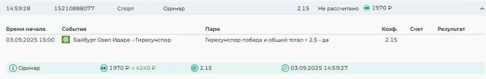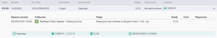 Результаты за вчера 03.09.25. Экспресс 100+,10+ и системы ставок не было. Банк 100 000 по каждому изменений нет. Лесенка х10 прематч банк 100 000, в разгоне на сумме 4260 р, флет кф 1.-7-2.5 зашло 3 матча 1 возврат, Банк вырос на 170 р, итого 1190,4 + 19,04%! Лесенка 1.7 прематч банк 100 000, в разгоне с суммы 6775 р, Догон выигрыш на первой ступени, Банк вырос на 1150 ₽, итого 358970₽, + 0,59%! Флет лайв Банк вырос на 1150 ₽, того 102120 ₽, + 2,12%! Лесенка лайф банк 100 000, продолжаем разгон с суммы 4240 р.