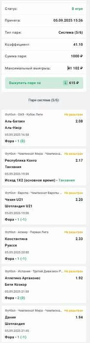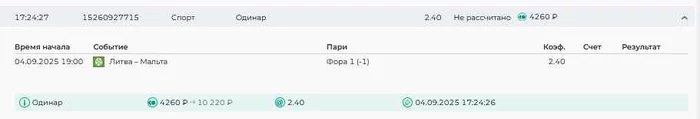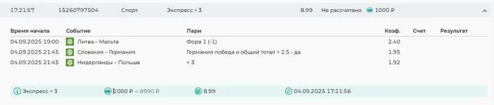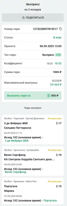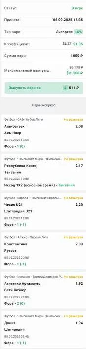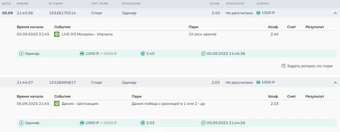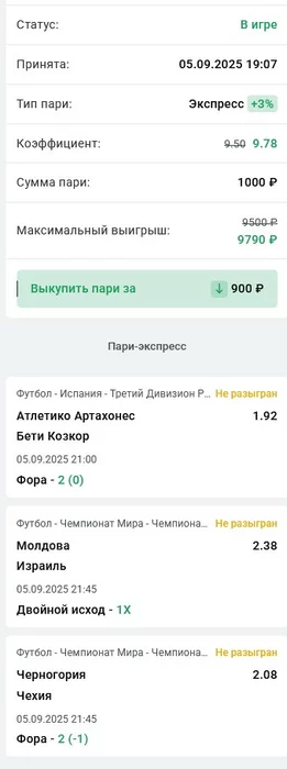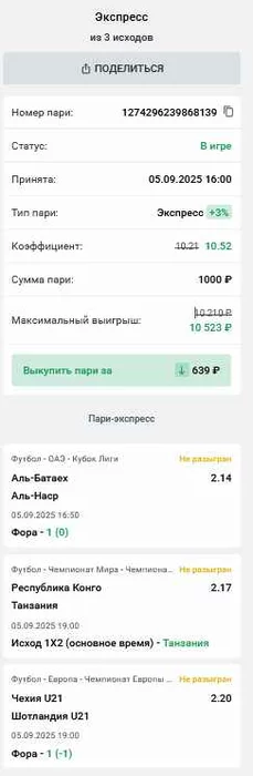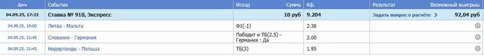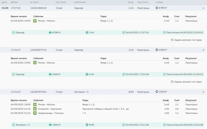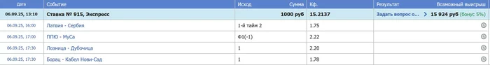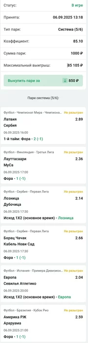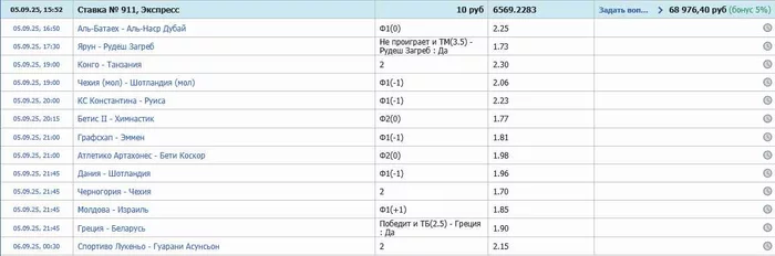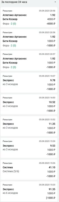 Результаты за вчера 05.09.25. Экспресс 10+ 2 проигрыша-2000р, итого банк 97 000 -3%. Лесенка х10 кф2+ прематч 2 проигрыша, банк уменьшился на 2000, итого 97 000 -3%, в разгоне на сумме 1000 р, флет кф 1.7-2.5 6 проигрышей 6 выигрышей, банк уменьшился на 2.3 р, итого 995.1 -0,49%! Лесенка 1.7+ прематч банк уменьшился на 2000, итого 97 000 -3%, в разгоне с суммы 1000 р, Догон проигрыш на второй ступени, начинаем сегодня с третьей ступени, банк уменьшился на 4000 ₽, итого 355120₽, - 0,08%! Флет лайв Банк уменьшился на 3000 ₽, итого 98120 ₽, - 1,88%! Лесенка лайф банк уменьшился на 1000, итого 98 000 - 2%, продолжаем разгон с суммы 1000 р. Что то на сборных не очень катит, продолжаем ставить и ждем начала нормальных матчей.