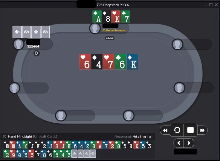 Далее я выиграл еще крупный банк и уже оппонент поплыл из-за короткого стека. Начав более агрессивно играть, пошла лимитная омаха хай лоу, он начал со мной выставляться каждую раздачу. Первое выставление он выиграл с сильной рукой, удвоив стек до 8бб. В следующем олл-ине его четвертануло. И затем он отлетел c 3,5бб: