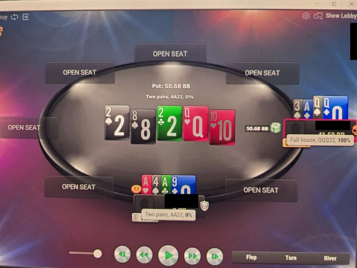 Мои оппоненты теряли концентрацию и начинали барелить или коллить на плохих картах Они пытались давить агрессией, стиллить мои бринг-ины. Но как я понял, все решает игра на поздних улицах.