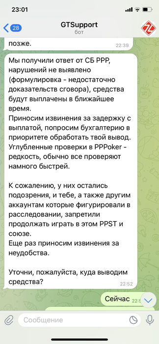 союз LosPokerHermanos 21 день назад инициировал поверку моего аккаунта, сегодня ровно 21 день с момента начала проверки и что вы думаете новости 🗞️ появились ?нет! ждём 00-00, и далее требуем мои средства от моего аффа!