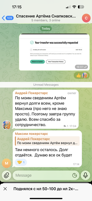 Ну Артём скинул скрин из группы кредиторов/бэкеров. Там он почти со всеми расплатился (остался один человек, которому тоже отдаётся долг постепенно и он сам это подтвердил).