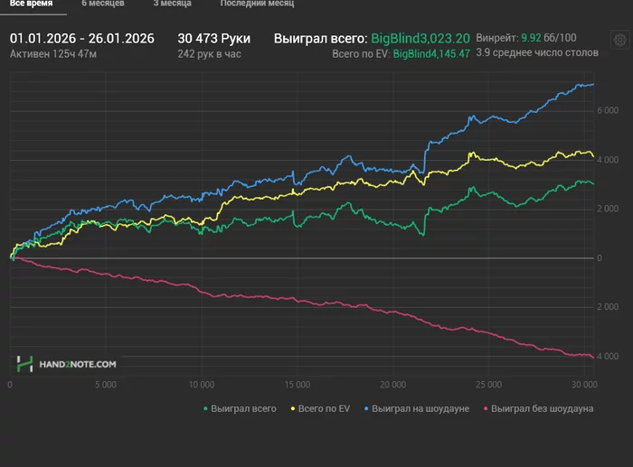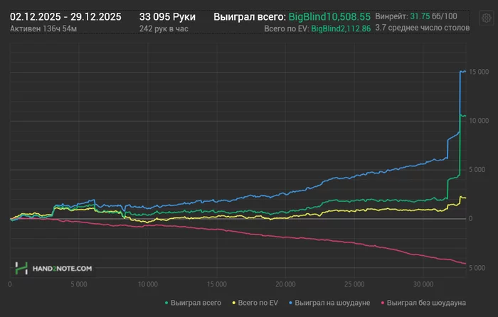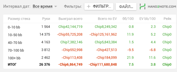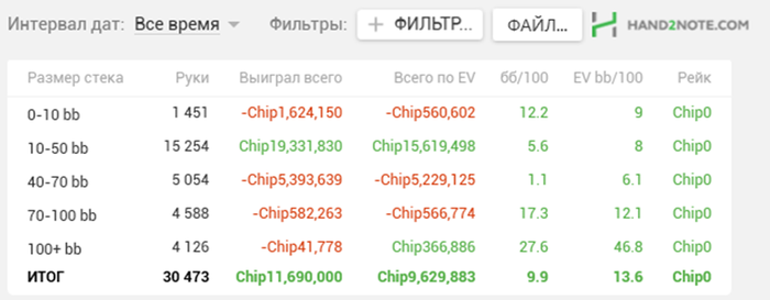 - Самое главное, удалось увеличить качественный показатель - EV bb/100 в 4 раза! Это успех! Конечно, можно возразить что 32к рук это не дистанция, и что в средних стека ЕВ куда ниже, но ошибки в игре разобраны и думаю, что ЕВ и дальше будет расти.