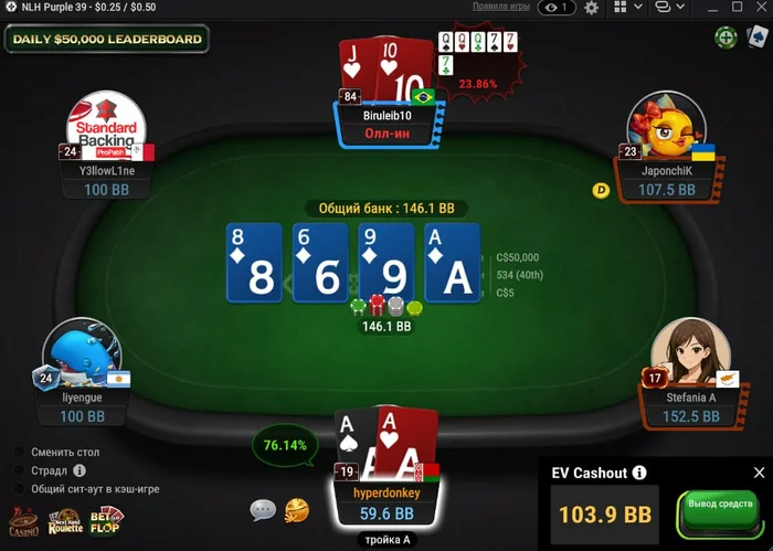 Откатал сессию 10 часов, в середине летел -100$, потом немного отпустило и под конец поймал свою золотую рыбку, 150 бб дипы nl 50, не осуждайте за колд колл, эта рыбка нужна была мне на постфлопе. Впереди суббота/воскресенье ещё +20 часов катки, посмотрим получится ли выбраться с плато за эти выходные