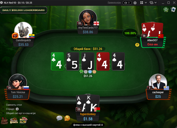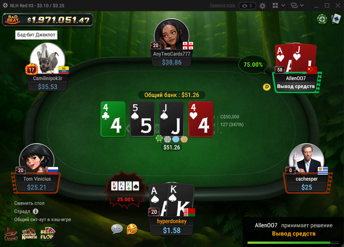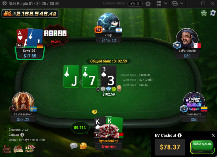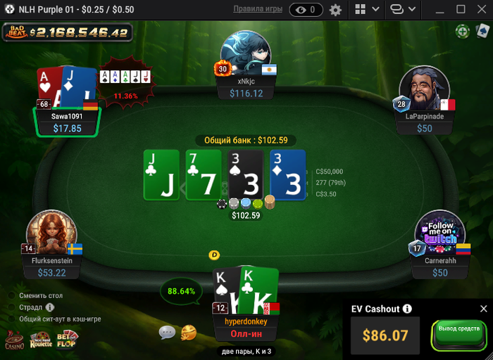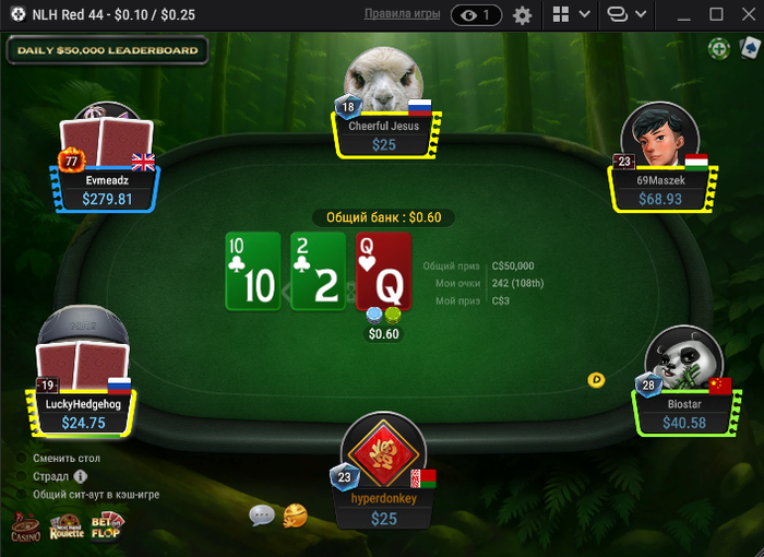 Сегодня на нл25 была вакханалия залетел фиш которого мы всем столом пичкали деньгами, чел набил себе стакан 1,119 бб = 279$ буквально за пол часа