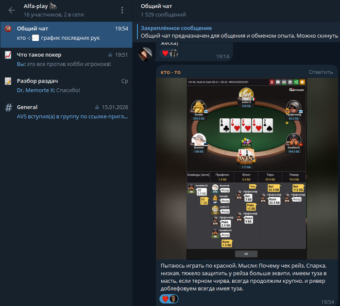 В декабре я создал закрытый чат, и нас уже 16 человек. В свое время целый год я играл без комуникации с игроками и думал, что покер это путь одиночек и спустя два года своей игры понял, что надо создать комьюнити единомышлеников.