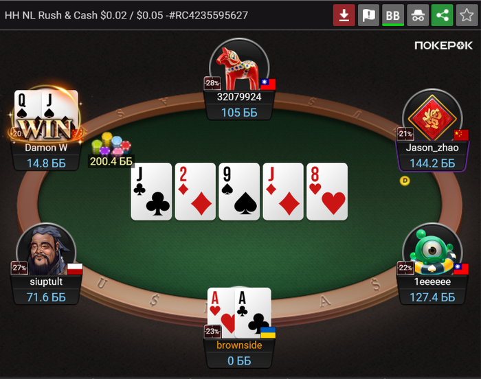 2. Я сыграл максимально слабую линию, и дал понять оппу что у меня нету J и дал пространства для блефа, на месте оппа я бы блефанул