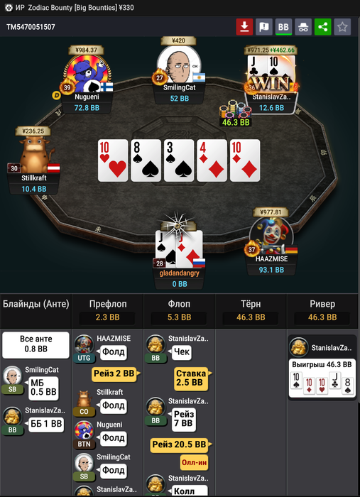 В другой — агрочел с VPIP 38 линией бет-кол / лид / пуш при SPR 0.3 доезжает ранер-ранер стрит.