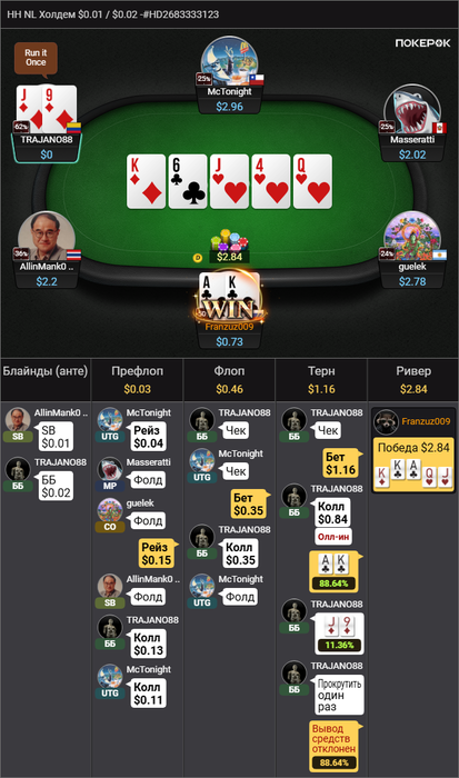 squirrel367, да я в этой раздаче еще и рейз бешенный на терне сделал хотя не хотел так, случайно в общем так накрутил, в целом да, думаю не оптимально сыграно.