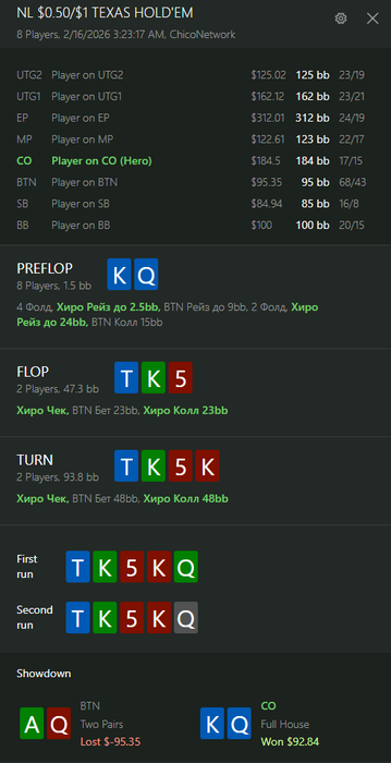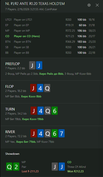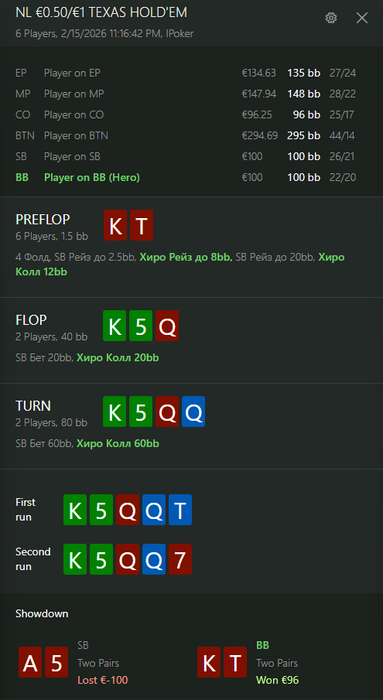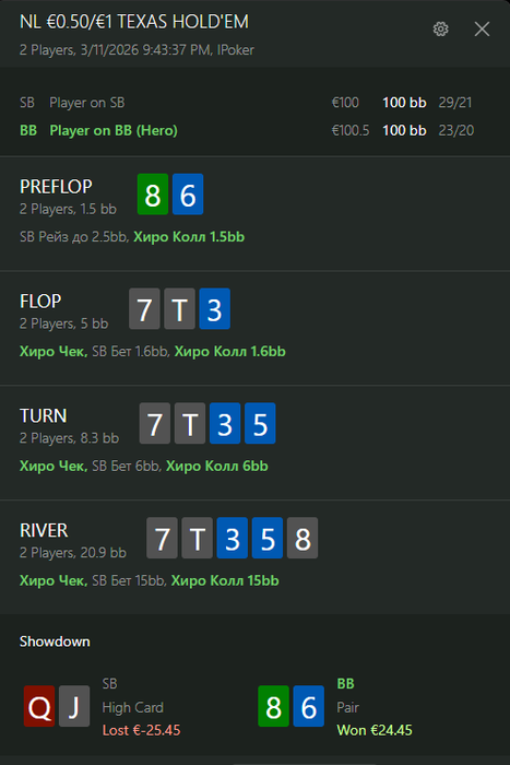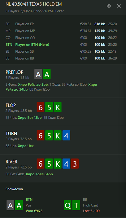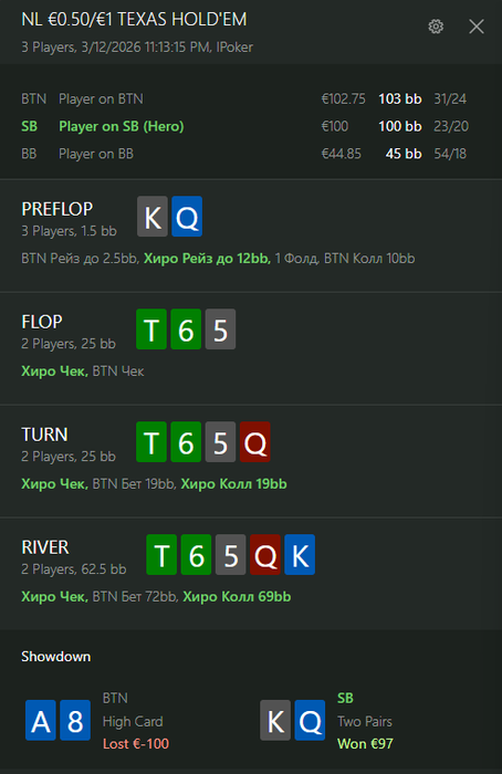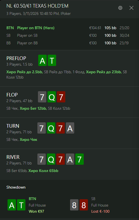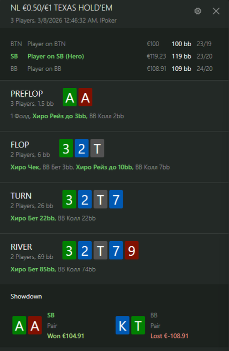 По итогу мы имеем спот, где оба оппонента репрезентуют очень узкий некапнутый рендж. Мой оппонент на вид солидный рег и нет причин думать, что он может как-то замувить против очень сильного ренджа или переиграть руку слабее, пока он не докажет обратное.