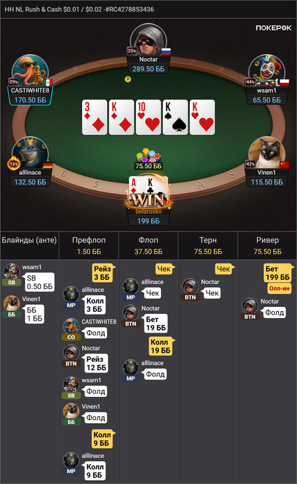 Поясню почему я размышлял над тем, чтобы сбросить. Если сделать ресёрч всех моих игр с этой рукой (АКо), то я уверен, что она у меня в нихуёвом минусе, бо как я не разыгрываю эту руку, особенно в оллыне на флопе, всегда меня с ней переезжают. Мб это выборочная память, но маловероятно, но в этот раз рука не подвела) на видео в принципе всё сказал, хотелось кулернуть какие-то JJ-QQ, TT туда впихнул, но не всегда они 3 бетят против ранней + далеко не всегда чекнут тёрн. Так же + к моему оллыну, это то, что не всегда опп поверит в карэ, хотя в дипах наверное нужно было сыграть от ставки, а не пуша, просто на таком борде мне ничё как-будто не заплатит, из того, что на оллын не заколит. Делитесь своим мнением в комментах, кто как в таких ситуациях играет