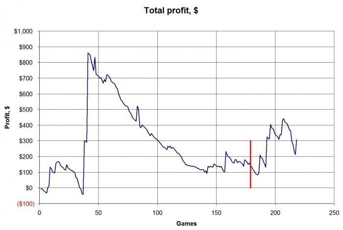 Да, посмотрел твой пример. Это, конечно, никакой не "пример", это уникум:) Нужно будет помониторить его игру. Кстати, очень любопытно играет человек. Я подразумеваю кое-какие особенности его статов. К примеру, крайне мало играет в так называемые "самые фишовые дни" - у него меньше всего турниров пятницу, субботу и воскресенье. Это вообще очень любопытно. Говорю это потому, что и сам показываю наиболее плохие результаты именно в эти дни. Даже думал прекратить играть в выходные. Кроме того, у него совершенно сногсшибательное распределение по конечным местам в турнирах. Почти 5% первых мест, то есть чаще всего этот парень заканчивает турнир именно на первом месте. Потом какое-то очень "невезучее" у него 20-е место, а дальше...2-е! Потом - 3-е. По МТТ всё тоже очень интересно. И вот какую странность я заметил: человек играет обычные СнГ по 45 участников, в то время как почти все МТТ у него - турбо. Интересная логика. Короче, этот пример не годится. Потому что тут всё, судя по всему, сошлось: и мастерство, и талант, и удача. Бери с него пример или не бери, но если таланту нет, то хоть расшибись... Но человек интересный, слов нет. Спасибо за наводку.