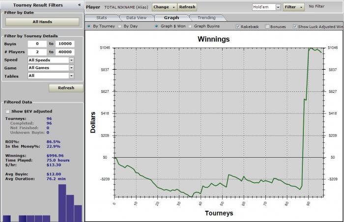 И когда у меня осталось 50$, я сказал себе "Все, хватит!", сосредоточился и начал играть. Благо выдался удачный день и я заметил, что ГСЧ Пати выдает подходящий флоп если заходить на J2. В этот день я выиграл 500$ и поднялся на лимит выше. Благо на NL200 за столом попался полный фиш, который раздал 10 баинов и соскочил. Так я заработал 1500$.И когда у меня осталось 50$, я сказал себе "Все, хватит!", сосредоточился и начал играть. Благо выдался удачный день и я заметил, что ГСЧ Пати выдает подходящий флоп если заходить на J2. В этот день я выиграл 500$ и поднялся на лимит выше. Благо на NL200 за столом попался полный фиш, который раздал 10 баинов и соскочил. Так я заработал 1500$.