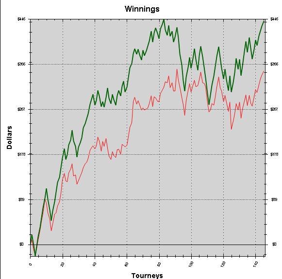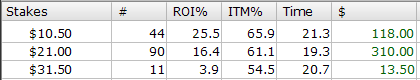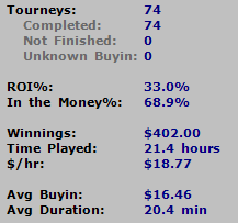 Играл мало. Один день совсем выпал. В основном играл один стол, хотя были дни, что чаще 2-а стола. Радует что линия EV по вектору в основном совпадает с линией профита, хоть и ниже. Знаю что 74 турнира это не дистанция.