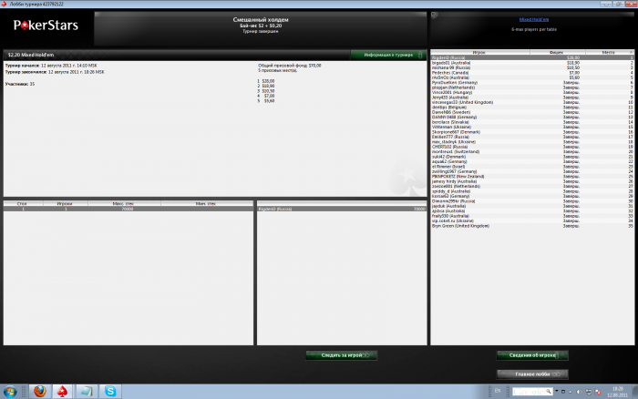 Poker Stars $3.00+$0.30 No Limit Hold'em Tournament - t1250/t2500 Blinds + t310 - 6 players -