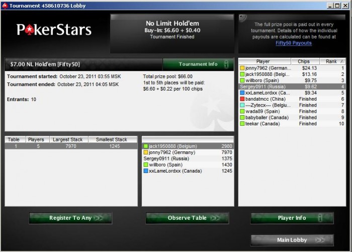 Первой рукой Джонни зашли короли, которых он незатейливо разыграл опенпушем. Сидевшее за ним АВ подумало, что вколить Джонни - классная идея. Видать у человека был на Джонни какой-то железный нотс Второй рукой Джонни зашли дамы. Угадайте, как Джонни их разыграл? На этот раз коллеров у Джонни было двое. То, на чем они его коллили, не достойно даже упоминания. Третью руку Джонни каким-то чудом не выиграл, а четвертой с получил флоп и тем самым убрал с дороги двух человек с и . Турнир на этом окончился.