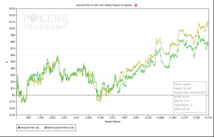 Давно я не писал суда, друзья я можно сказать окончательно перешел на NL10(ZOOM), играется не так хорошо как хотелось бы в один момент затильтовал и 3к рук заливал... хочется пожаловать на КОРОЛЕЙ!!! ни одного префлоп алына с ними я не затащил, за последнию неделю точно, скоро начну на сэт онли с ними заходить :DDD вот кину вам график, тут не все руки, какую то часть я играл на ноуте, этих рук тут нет и самые первые руки я потерял, когда пытался их в Elephant импортировать еще конечно не учитывается 50$, которые я получил, за отыгрывание 750VPP итого за все проделки плюс 160+ зеленых к банкролу.