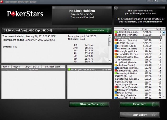 Сел ко мне за стол со стеков 27К. проиграл 2 банка подряд окрываясь рейзом >4ББ и колируя потом 3бет (показав потом А7 и K4).