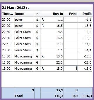 Купил софтину, установил, попробовал. Вообще, достаточно полезная штука, тем более за эти деньги. Сразу пожелания и замечания: 1. В списке турниров нет времени, поэтому, когда загружено 8-10 однотипных турниров с одинаковыми бай-инами, возникает путаница. Особенно актуально это, когда все они ребайники - путаешься, куда ты добавлял аддон, а куда еще нет. 2. Думаю, неплохо было бы предусмотреть добавление СНГ автоматически. К примеру, играю я сессию из СНГ на 180 чел по 15$. Играю их 30-40 за вечер. Очень неудобно каждый раз после добавления новой строки вносить рум и БИ для повторяющихся турниров. 3. Каким образом отображать отыгрываемые бонусы? Включать их в призовые по какому-либо турниру, записывать как трансфер или как-то еще? Пока включаю в призовые по турниру, после которого этот бонус был начислен. Но это не совсем правильно, так как ИТМ может и не быть в этом турнире, а в поле "Кол-во ИТМ" значение увеличится. 4. Нокауты так же не совсем правильно включать в ИТМ, так как реального попадания в деньги не было. 5. Ну, и все же, раз это программа для БРМ, то неплохо было бы делать в ней автоматическую фильтрацию, исходя из текущего состояния БР