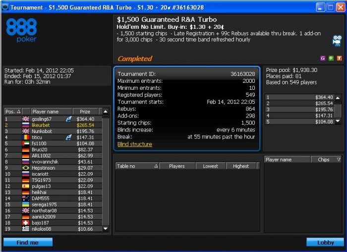 Вчера -20$ Сегодня простудился, поэтому решил задепать 50$ на 888, потому что играть по 20 45максов не в состоянии под температурой, поставил 2 турика под фильм - 1 неплохой недозанос, в hu вышел с 2.2mln vs 700k, но Aj<AA 55<Q10 убили меня, но опп рег вроде как, так что я всё равно доволен)