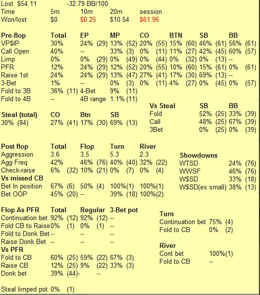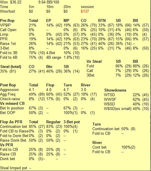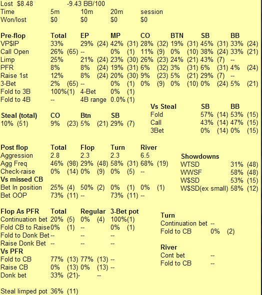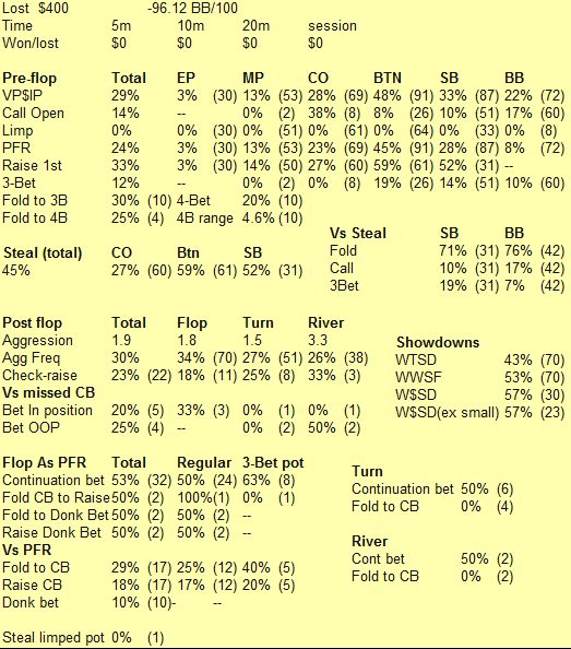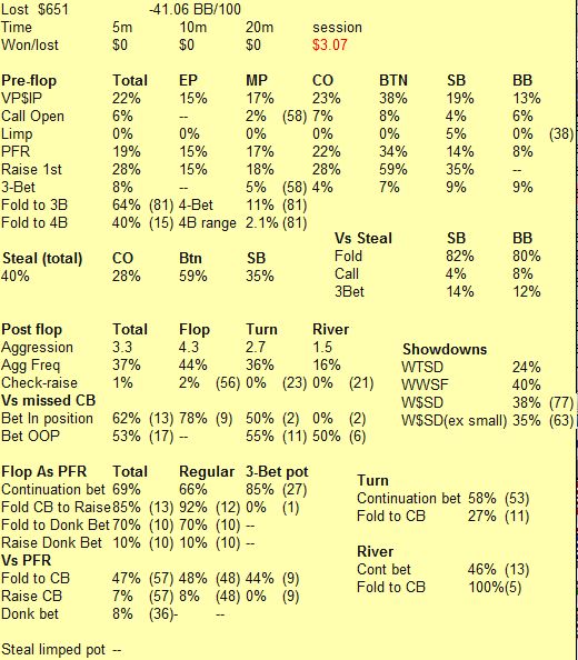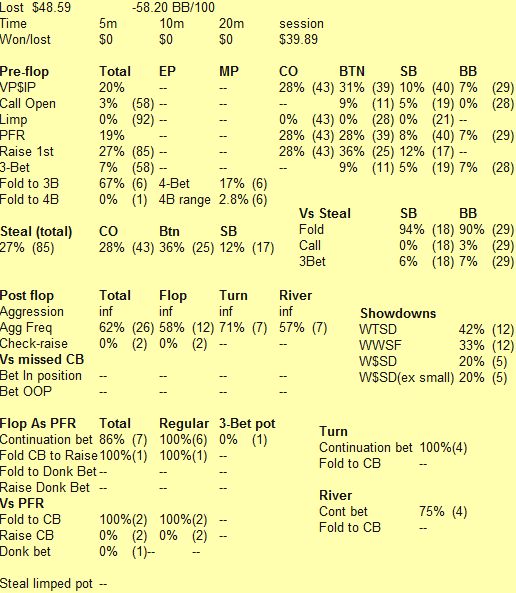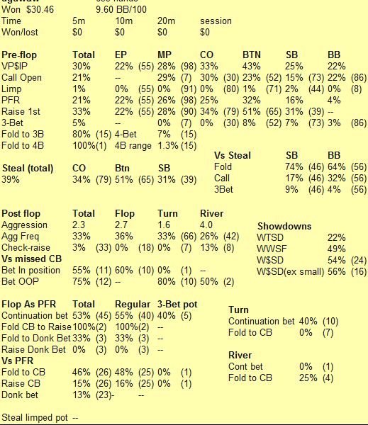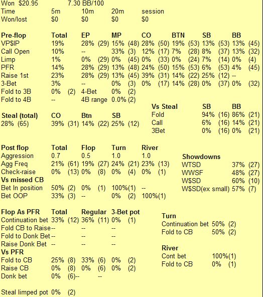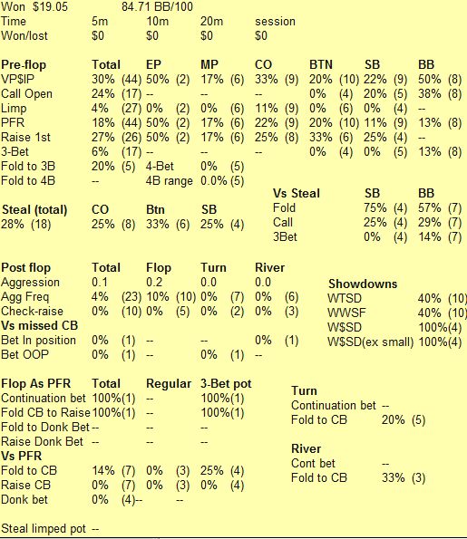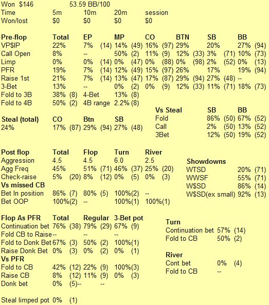 21. На оппа больше 3к рук, статы его в табличке ниже приведены, играл с ним много ещё до того как ноутбук показал белый экран и все сдачи остались на нём. Префлоп не вижу смысла переставлять, он врядли будет коллить без позы, как дальше сыграно? Стандарт вроде?