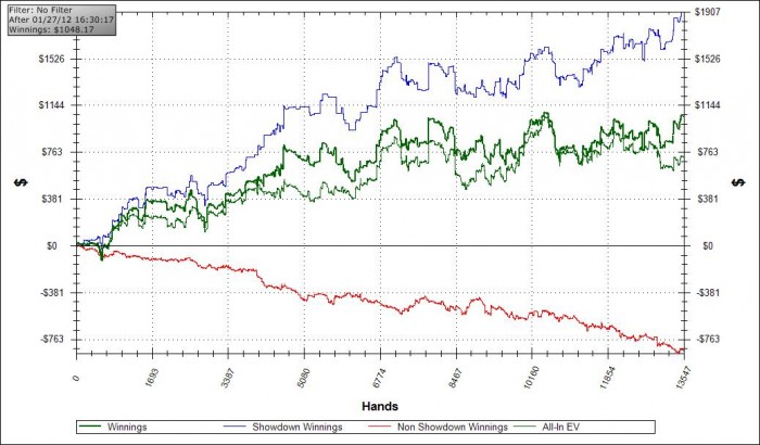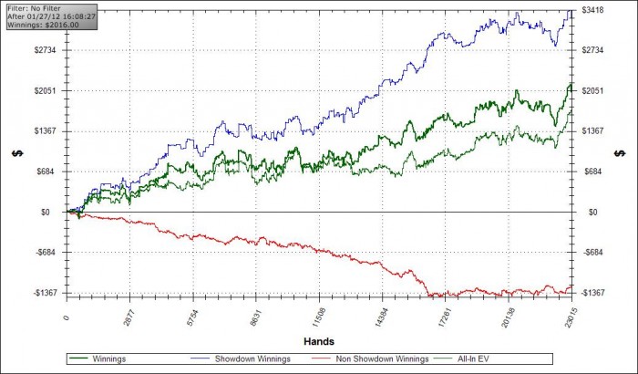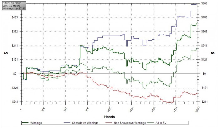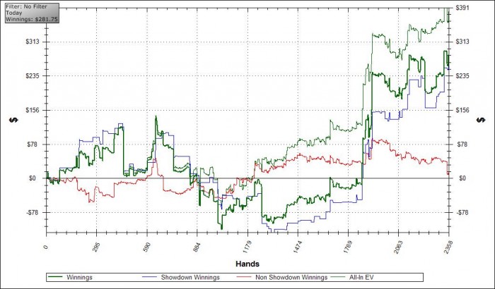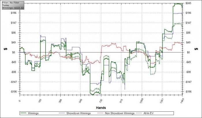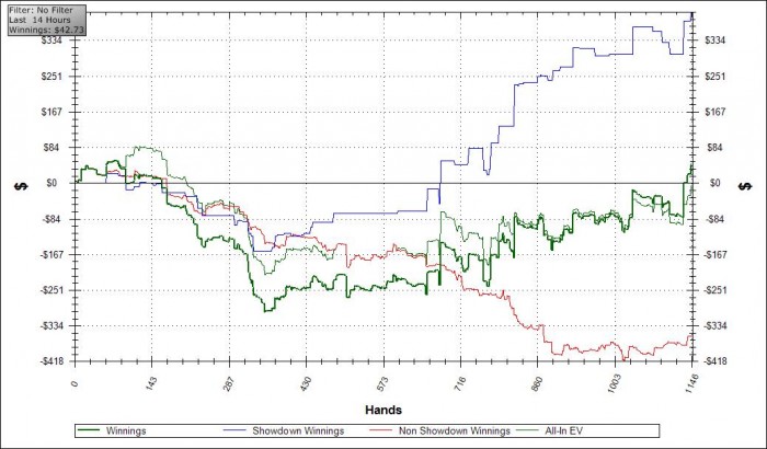 Обо всём по порядку, не мог не посмотреть свой любимый клуб Барселону, в итоге поспал 4 часа, встал ранним утром и повёз маму в больницу, вернулся тока пару часов назад, прождали в дикой очереди с 9 до 16.00 и тут нам объявили что они видетели не туда посмотрели и перепутали к какому врачу и приходите завтра,... я до сих пор в тильте...Приехав и пожрав я совершил глупость, сел катать в хреновом настроение. (опять же связаный с тем что все мы люди у всех есть проблемы, эмоции и т.д.) хотя много раз говорил себе об этом, памятуя как не так давно играя в 0 нл 200 и в 5птбб за 100к рук а потом ещё 3 птбб за те же 100к рук нл 100 и имея бр 7к без рейкбека я умудрился узнав плохую новость закатать 2700 за день (13.5 би не так много но сумма умопомрачительная, обновил ворст дей) и после этого как зомби садился играть каждый день продолжая заливать, пока с выводами не опустился обратно на землю. Вообще это необъятная тема для разговора, ведь мы каждый день садимся в неоптимальном состоянии, каждый по разному, каждый по своему переносит и т.д. Я тока на своём примере мог бы привести десятки случаев когда даже просто пара слов дорогому человеку или от от него сразу вводило в дикий тильт и заканчивалась хренова а даже если хорошо то на душе было не до катки но не буду об этом. В общем я не закатался нет, на шару утащил 2 би но чувство того что мне пох, что я играю плохо и каждый проигранный пот меня выводит в нереальный тильт не покидает меня до сих пор. Плюс я пока ждал в больнице прочитал снова книгу ктса и нгуена выучил чек-рейз на ривере и даже исполнил его вообще не парясь выиграю я или проиграю, ведь состояние дерьмо, а ктс сказал что это ЕВ значит пох...Я ушёл даже сидя с 250 бб против дикого фиша тоже с 250 бб и я на него в позе. Хоть что то умное сделал. Короче нахрен покер сегодня, выложу график и пойду кого нить застрелю в контру...да и накачу пивка, Мише что то выпить захотелось...