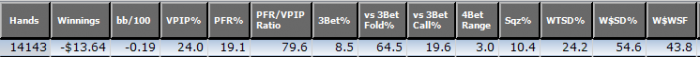 Если глянуть на стату, то сразу в глаза бросается большой фолд на 3бет, ну и соответственно маленький кол 3бета. Не знаю с чем ты колируешь 3беты, но я бы расширял диапазон кола 100%.