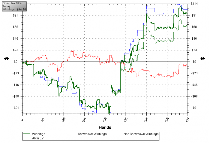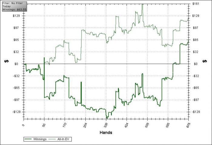 По графикам: 1. А не трудно будет добавлять win with/wo showdown? Ощущение такое, что ты в первом графике зажался из-за недоездов,переездов и красненькая (а вместе с ней и агрессия) пошла вниз. На второй — стал агрессивнее + ГСЧ ответил взаимностью :) 2. Сохраняй графики в png-формат, тогда они не портятся jpg-компрессией и выглядят также, как на экране.