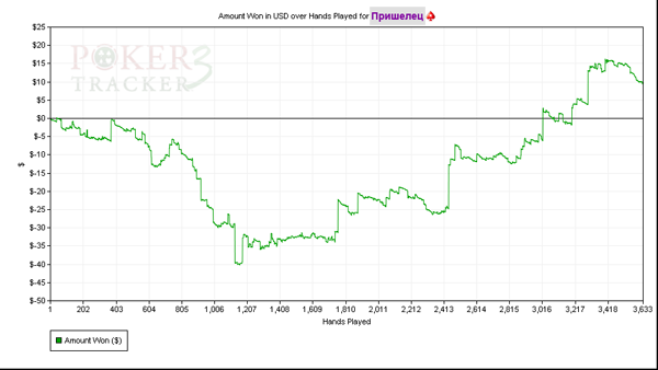 Как оказалось, разница между нл5 и нл10 есть. Фиши всё те же, но вот реги и полуреги уже намного агрессивнее и грамотнее. В итоге стилы, 3беты и конбеты работают немного по-другому. Играя 9 столов всё это стало ясно довольно быстро. За первые 1.5К рук проиграл 4БИ (график прилагается). Пришлось отключиться и проанализировать игру. Причем видно, что дело не только в больших и средних банках, а вообще во всем. График стабильно сползал вниз первые раздачи. Но подстроиться оказалось несложно. Игра всё ещё остается прозрачной. Надо лишь осторожнее действовать на постфлопе и аккуратнее стилить. Добирать на хороших комбинациях всё так же просто. Но чтобы график не сползал вниз, необходимо грамотно стилить, рестилить и конбетить./ Как видно после возобновления сессии график более-менее стабильно пошел вверх, сползаний почти не было. В итоге первые 3.6К рук удалось закончить в +1 БИ. Но главно не это. Вроде как удалось довольно быстро перестроиться на новое поле. Дистанция покажет.