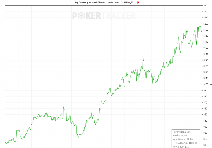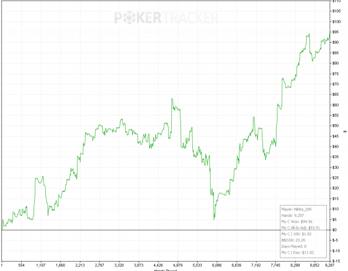 Я бы поменял 100 баксов недобора на 2 заноса в турнирах и счастливый стол. А то ни того, ни другого у меня за все время игры не было)) По графику нельзя что-то советовать, лучше раздачи в которых сомневаешься выкладывай)