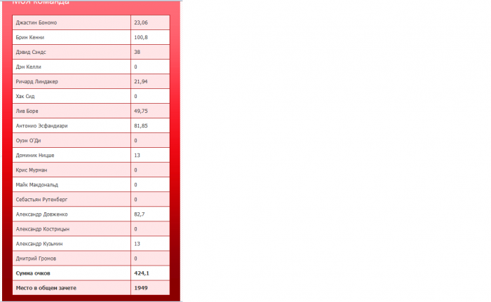 Фил Айви Шон Диб Эндрю Робл Джон Джуанда Ричард Линдакер Фил Хельмут Ванесса Селбст Антонио Эсфандиари новемба найн - все по нулям (но у Стажко завтра появятся очки) Доминик Ницше Джей Пи Келли Джонатан Дюхамель Марвин Реттенмайер Александр Довженко Владимир Щемелев Александр Кузьмин Константин Пучков