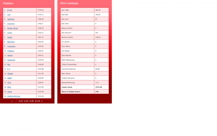 Бобёр @ 11.6.2012 Не знаю где спросить, поэтому здесь :) А можно сделать символическую дрим тим? То есть, после каждого пересчета публиковать наиболее оптимальную команду, но не тура, а всего всопа и то, сколько максимально можно было бы набрать очков, если бы кто то взял оптимальный состав.