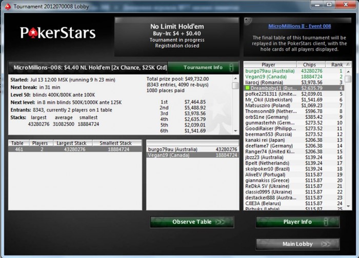 Poker Stars $4.00+$0.40 No Limit Hold'em Tournament - t200/t400 Blinds + t50 - 8 players -