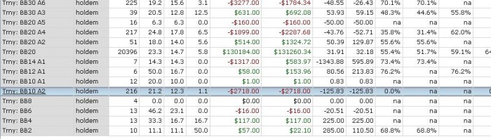 Анализировать это всё надо в визарде а не по тому что ты дал.... эта хрень полная.... в турнирах деньги делаются со знании ICM... И может быть по этим статам ты и сыграешь в плюс по фишкам заколив на вальтах к примеру оппа с достаточно лузовым спектром, а на самом деле ты будешь просто в минусе на дистанции по деньгам, зато по фишкам будешь сверх плюсовый игрок, только толку....